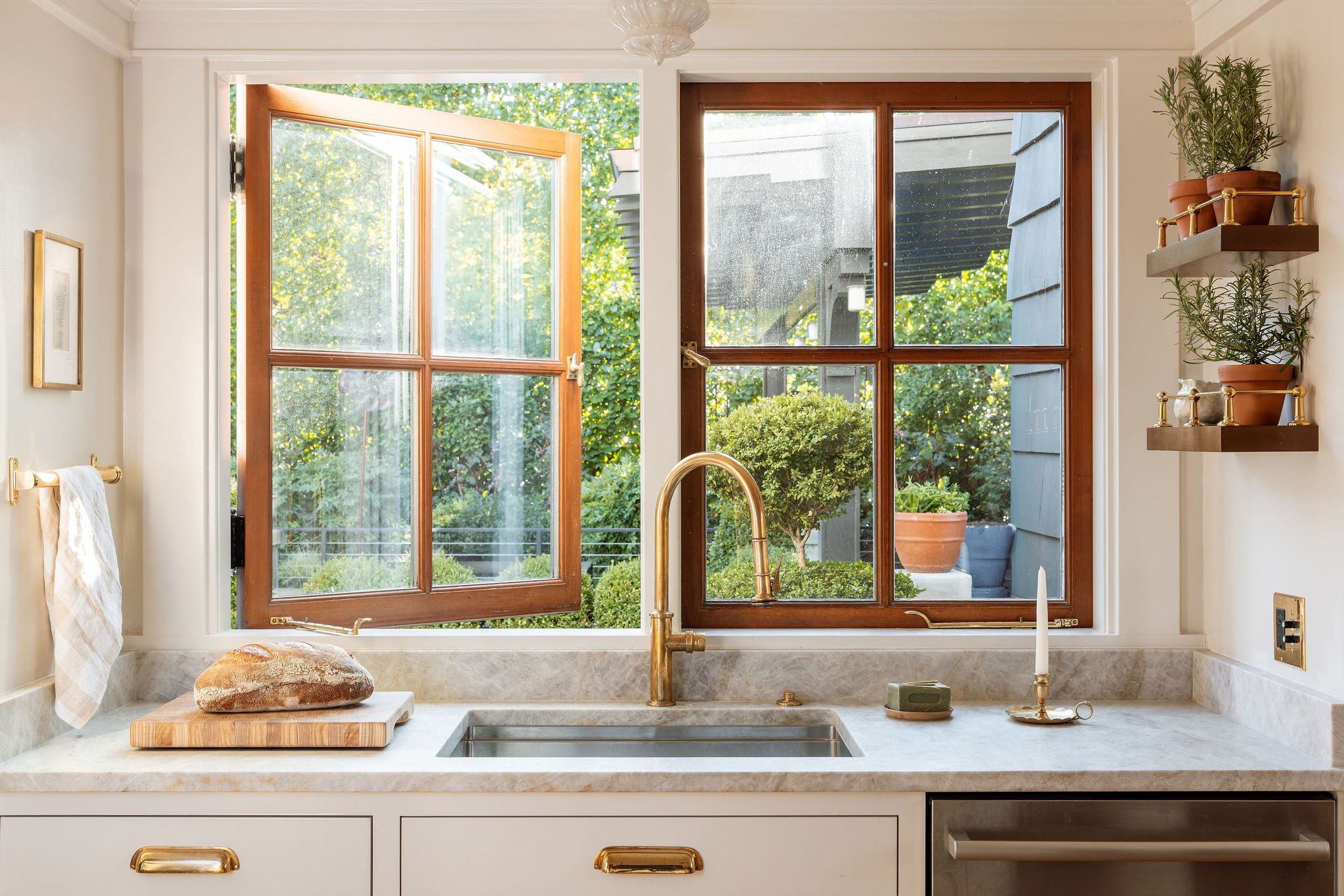 Custom cabinetry was thoughtfully designed to fit the existing footprint with precision, maximizing function without compromising character. A few favorite features include unlacquered brass hardware, built-in spice niches, arched toe kicks, and a custom island table. The result is a kitchen that feels not newly added, but thoughtfully restored, bringing the space back to life in a way that feels enduring and true to its origins.